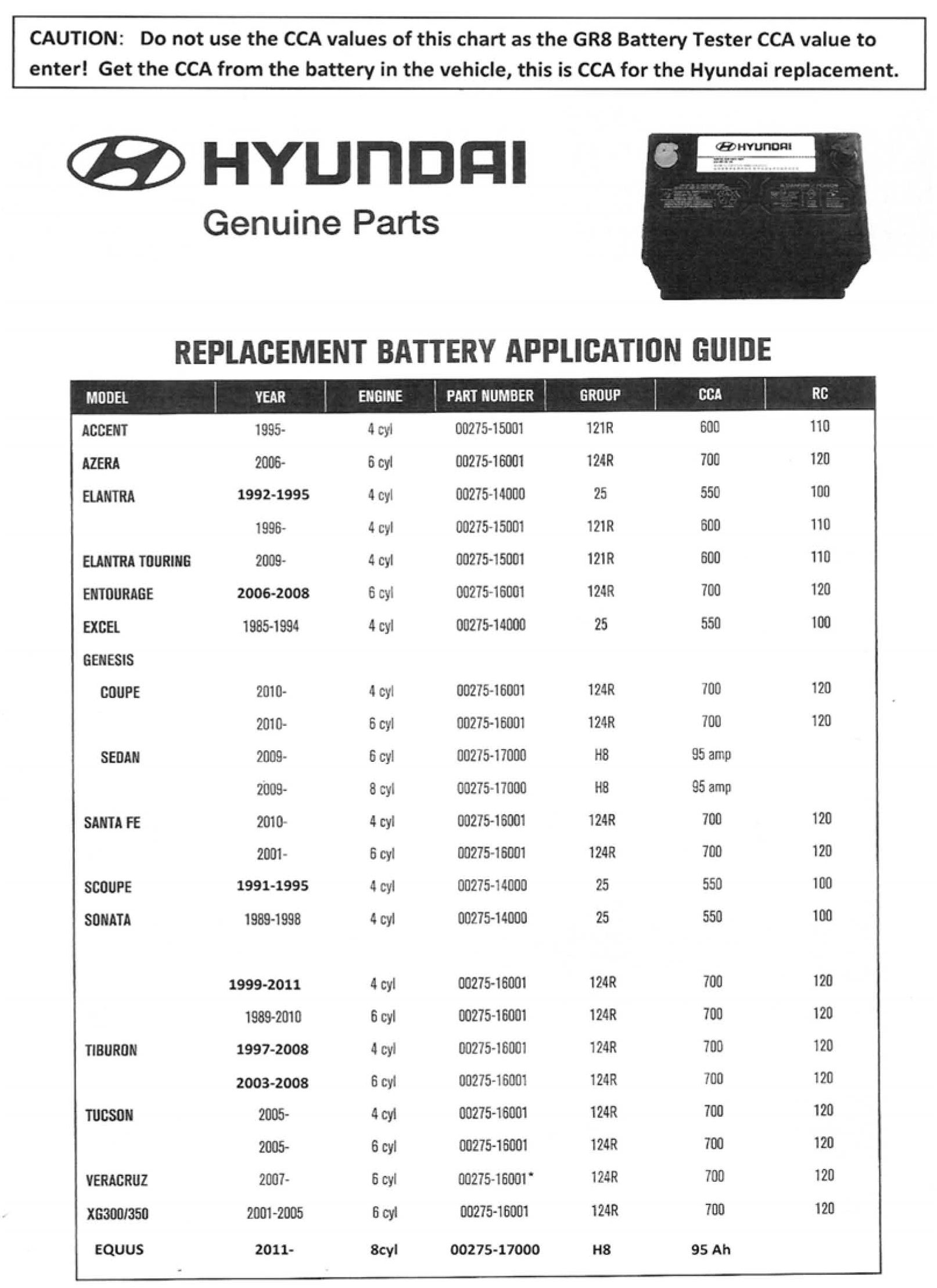 The Midtronics GR8-1270 Diagnostic Battery Tester/Charger Assembly launches in August 2010 as a new Hyundai required tool. A new Hyundai Battery Warranty Policy requires that GR8 be used for all battery warranty claims according to procedures outlined by the service procedure of this bulletin. Claims based on the Midtronics MCR-570 handheld tester will no longer be accepted.