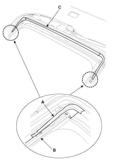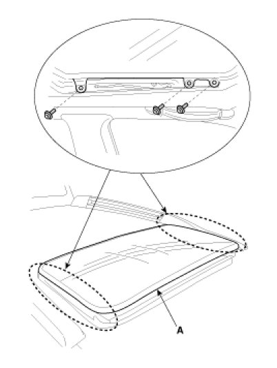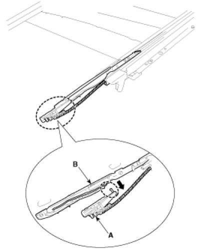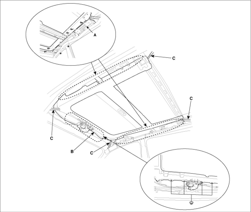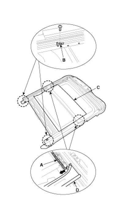 4. After loosening the mounding bolts and nuts, remove the sunroof assembly (B).