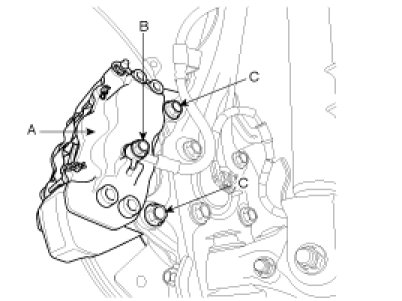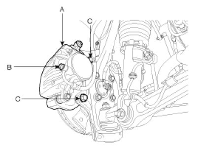2. Loosen the hose eyebolt (B) and caliper mounting bolts (C), then remove the front caliper assembly (A).