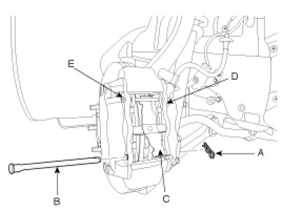 2. Loosen the guide rod bolt (B) and pivot the caliper up out of the way.
