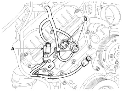 (1) Disconnect the water temperature sensor connector (A) and the CVVT oil control valve connectors (B).
