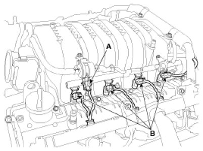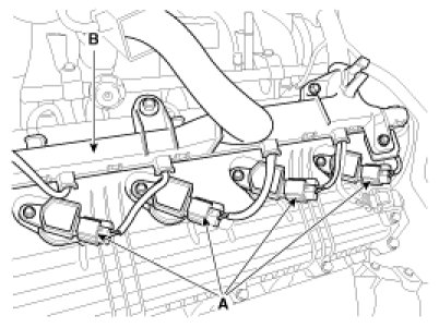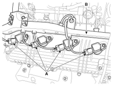 (4) Disconnect the PCSV connector (A) and the injector connectors (B).