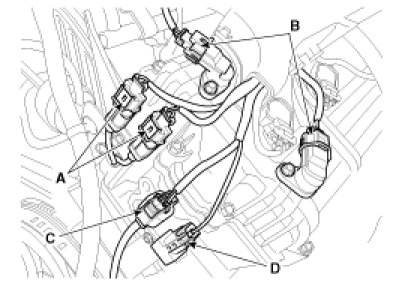 (6) Disconnect the knock sensor connectors (A), the camshaft position sensor connectors (B), the oxygen sensor connector (C) and the condenser connector (D).