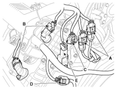 (8) Disconnect the knock sensor connectors (A), the camshaft position sensor connectors (B), the crankshaft position sensor connector (C), the oxygen sensor connector (D) and the condenser connector (E).