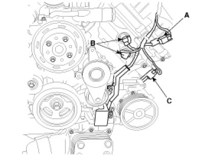 (11) Disconnect the oil pressure switch connector (A), the CVVT oil control valve connectors (B) and the air conditioner compressor switch connector (C).