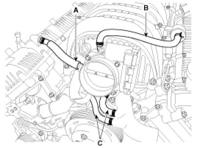 17. Disconnect the PCV hose (A), the PCSV hose (B) and the water hoses (C) from the intake manifold module and the throttle body.