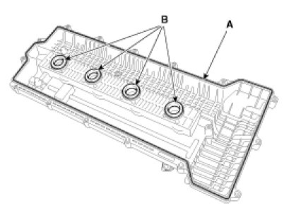 23. Remove the cylinder head cover gasket (A) and oil seal (B).
