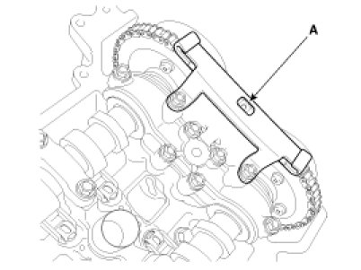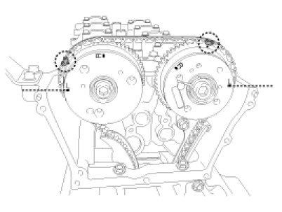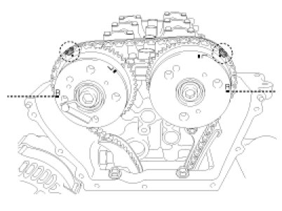 In case that the timing system has been disassembled wholly, the timing chain can be installed with all of chain installation mark of the sprocket and timing marked chain links aligned without additional marking. However, in case of on-vehicle repair (for cylinder head assembly, timing chain tensioner, CVVT, camshaft, HLA or etc.), which is not necessary to remove the timing chain completely, mark the timing chain links corresponding to the chain installation marks on the sprocket with an identification when the No.1 piston is at TDC position because it is very difficult to align all of the chain installation mark of the sprocket and the timing marked chain links.