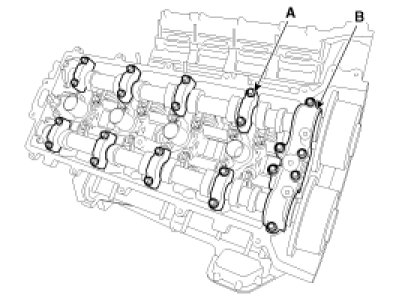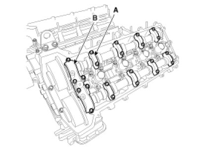 35. Remove the camshaft bearing caps (A) and the camshaft thrust bearing cap (B).