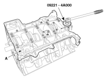 13. Using the SST(09231-2J400, 09231-H1100) and a plastic hammer, tap in a new oil seal(A) until SST surface is flush with the cylinder block.