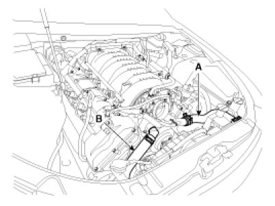 8. Disconnect the radiator upper hose (A) and lower hose (B).