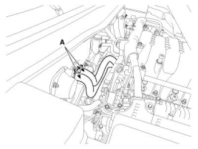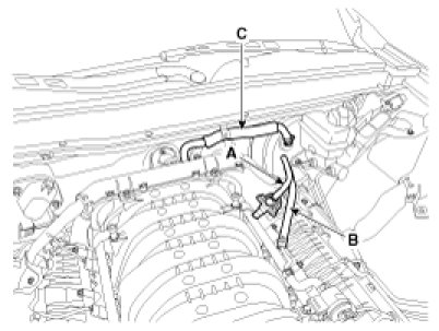 9. Remove the fuel hose (A), the purge control solenoid valve (PCSV) hose (B) and the brake booster vacuum hose (C).