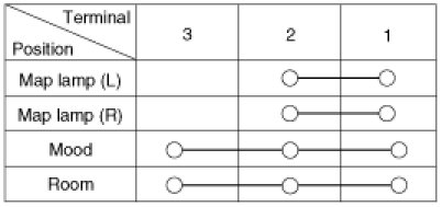 Remove the overhead console lamp assembly then check for continuity between terminals. If the continuity is not as specified, replace the map lamp switch.