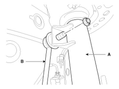 5. Disconnect the stabilizer link (B) with the front strut assembly (A) after loosening the nut.