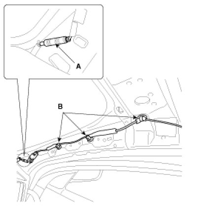 14. Cut off the sealant by pulling the piano wire (A) around the back panoramaroof assembly (B).