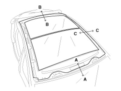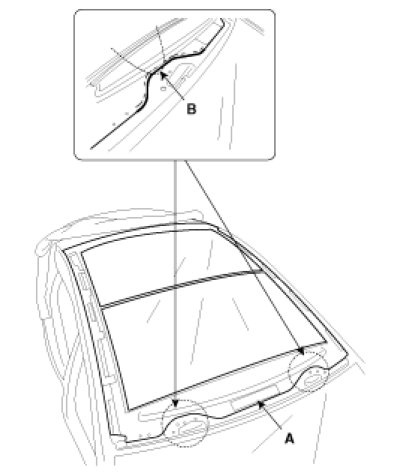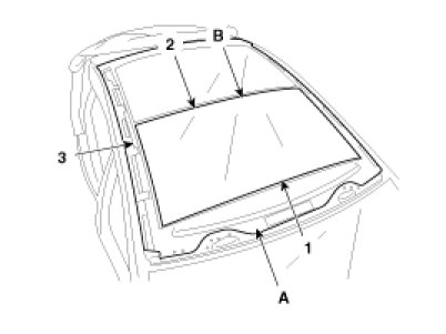 5. Pack adhesive into the cartridge without air pockets to ensure continuous delivery. Put the cartridge in a caulking gun, and run a bead of sealant (B) around the edge of the panoramaroof (A) as shown. Apply the adhesive within 30 minutes after applying the glass primer. Make a slightly thicker bead at each corner.
