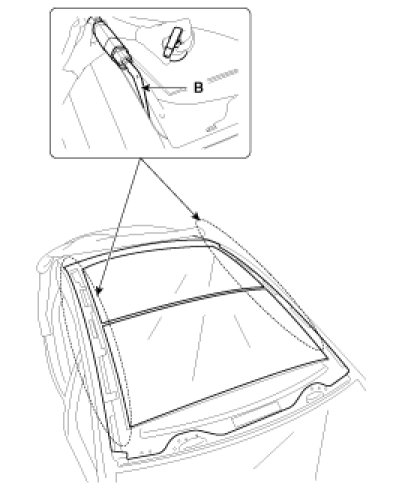 11. Open the space between chassis and sunroof using flathead screwdriver, and then cut the sealant of front using a tool (09816-2P121, 09816-2P122) (B).