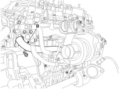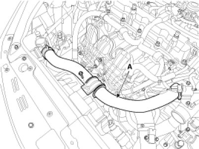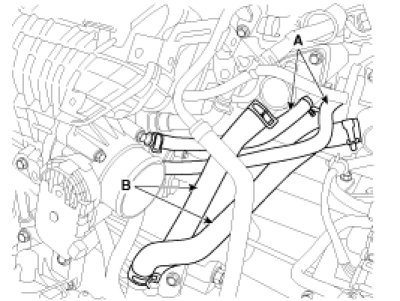25. Connect the radiator upper hose (A) and lower hose (B).