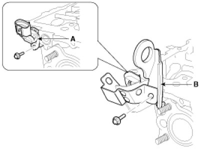 7. Install the exhaust CMPS (Camshaft position sensor) (A) and the engine hanger (B).