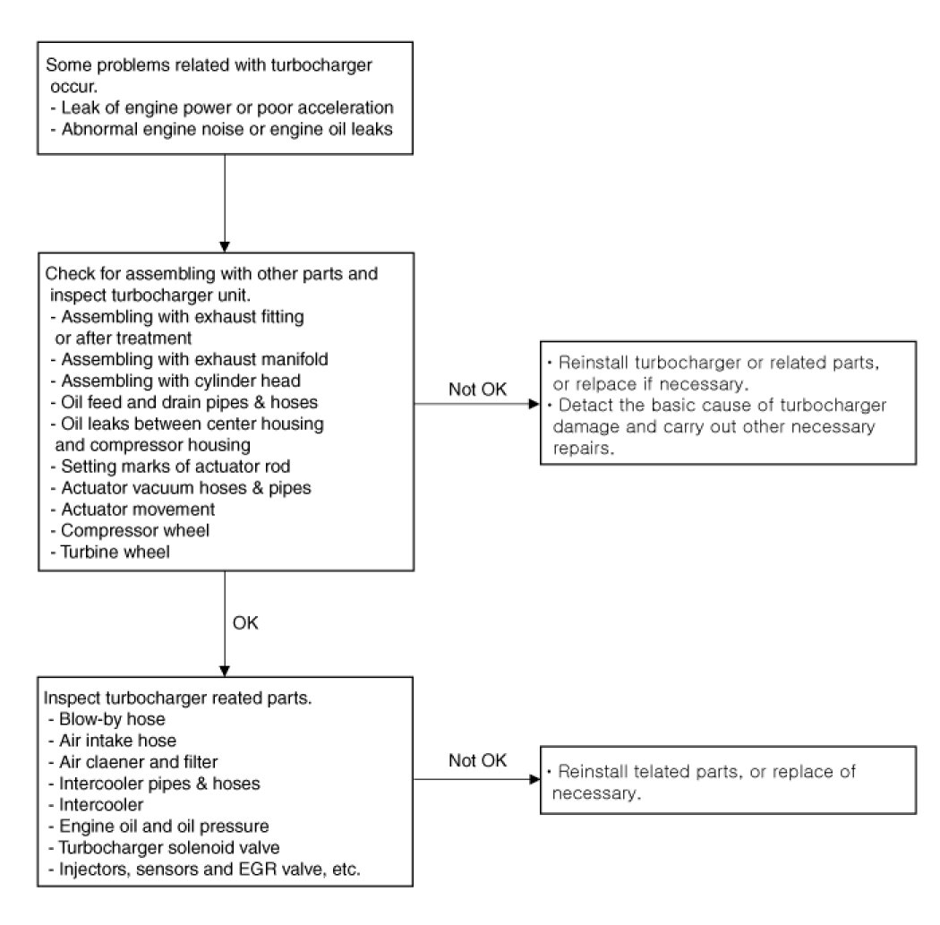 If any problem is not detected in the turbocharger, check the turbocharger-related parts according to the procedure as follows.