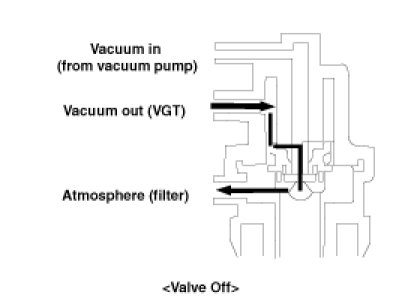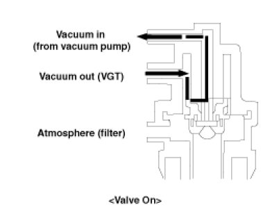 B. Clog of the solenoid valve filter: Check if vacuum is released when a forced actuator operating mode is performed from max. duty (95%) to min. duty (5%) by GDS. (If the solenoid valve filter is clogged, the vacuum won't be released or it will take a long time to be released.)
