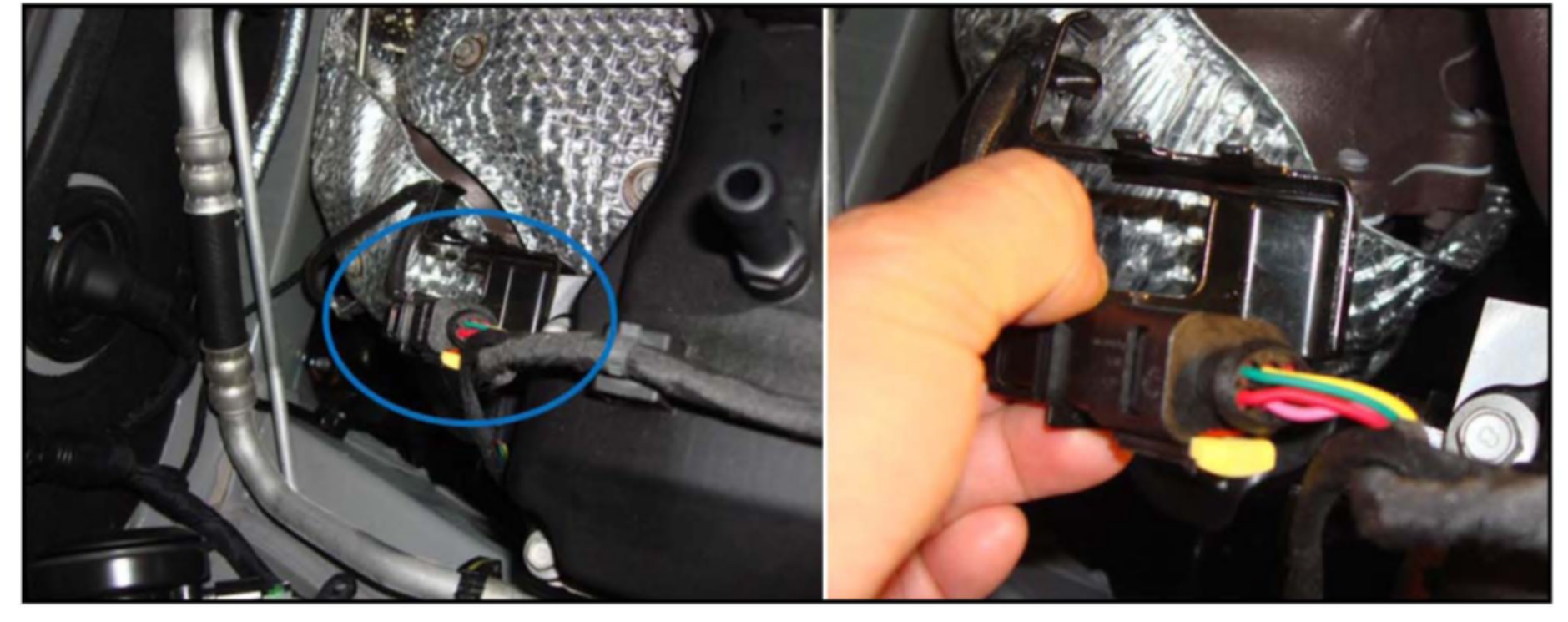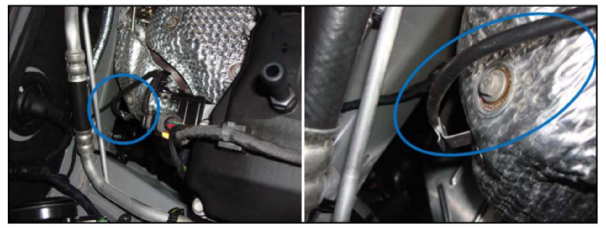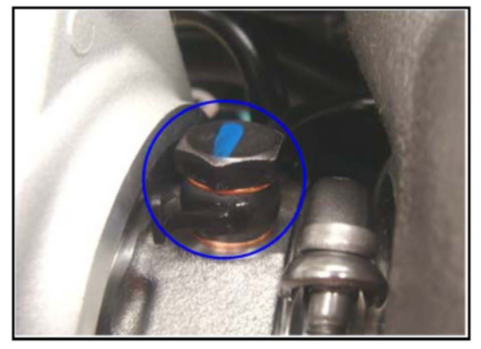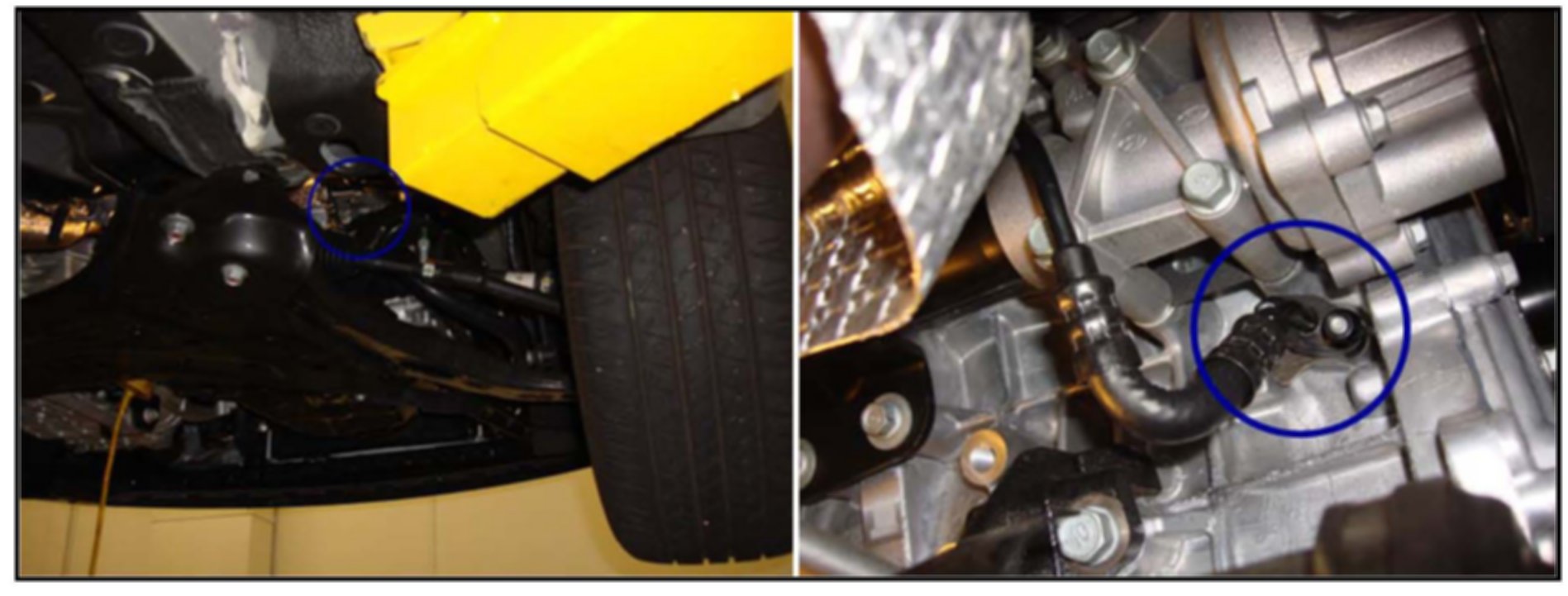 29. Raise the vehicle and inspect the connection point at the block for any oil leaks (as shown on the right).