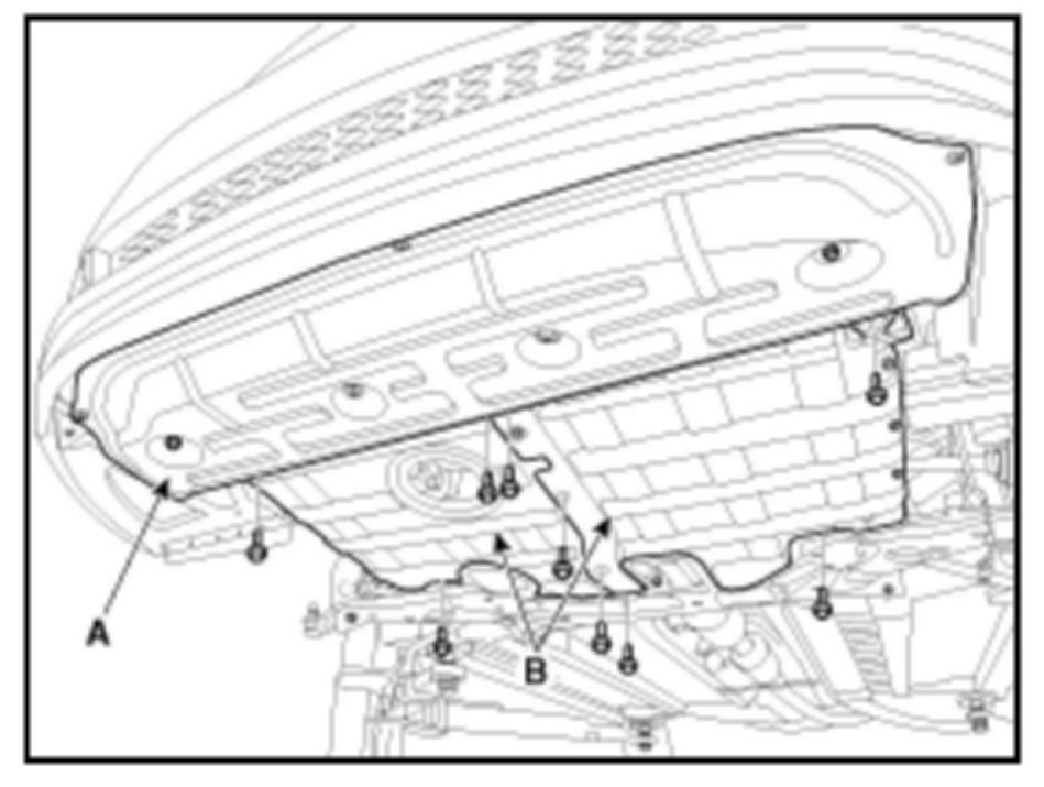 9. Remove the (2) plastic screws, (5) metal screws, (3) short 10 mm bolts, and (3) long 10 mm bolts retaining the under covers (A) and (B).