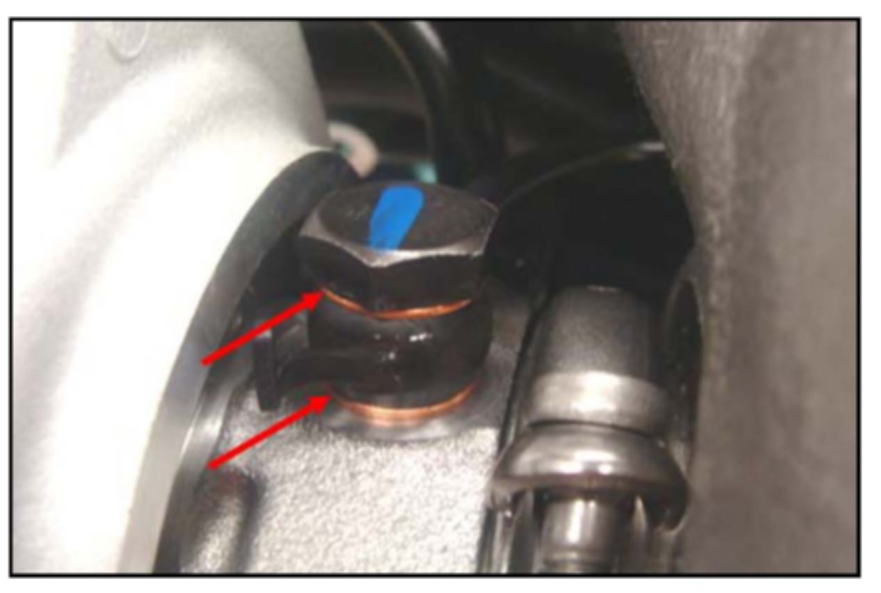 ^ Copper washers must be installed (1) above and (1) below the banjo fitting when the banjo bolt is hand threaded into the turbocharger.