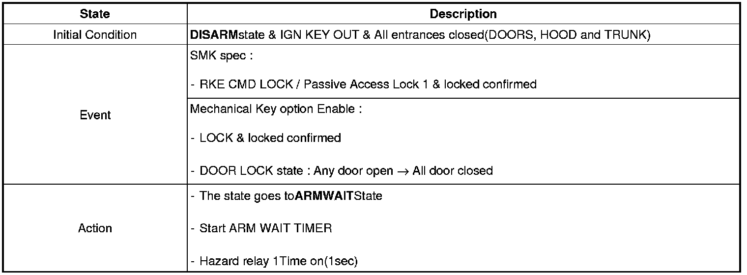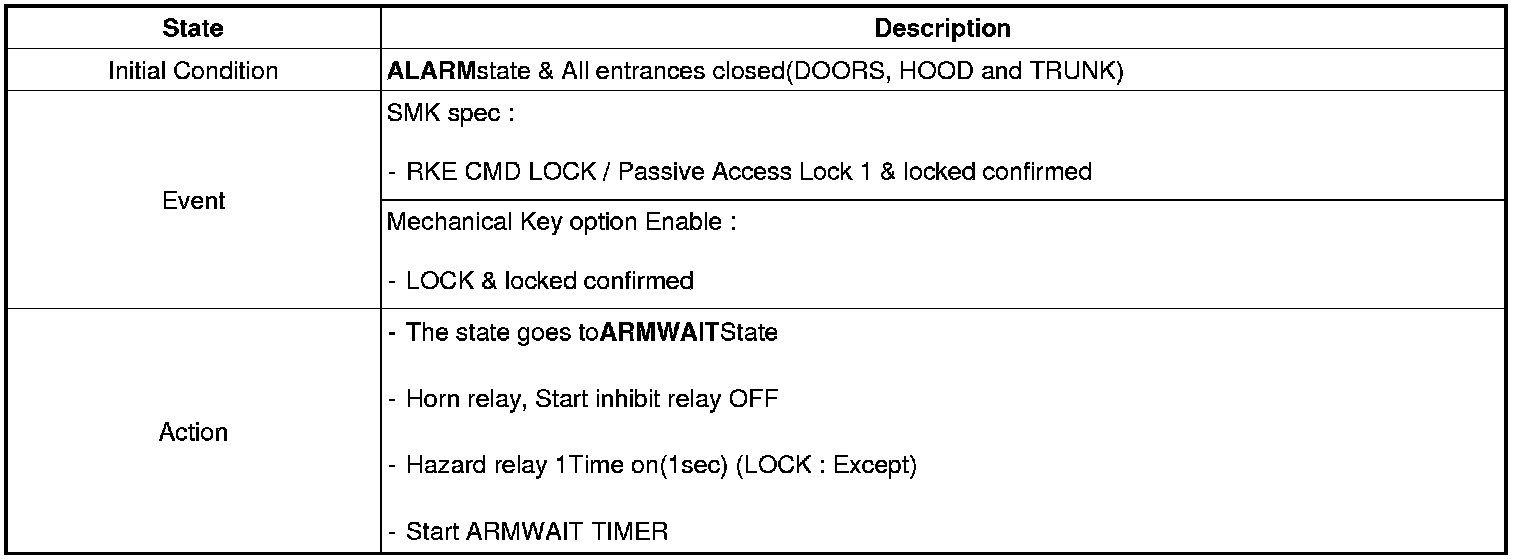 The door switches, hood switch and trunk lid switch are all close and lock the doors with the remote transmitter and then the system arms after 30 second.