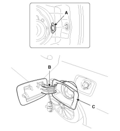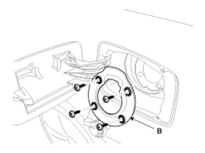 2. After loosening the mounting screws, then remove the fuel fill door catch packing (B).