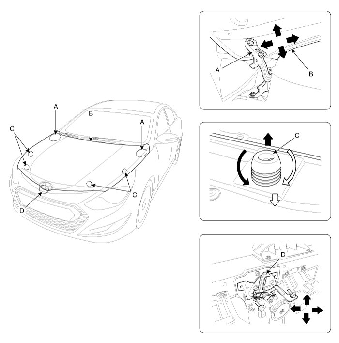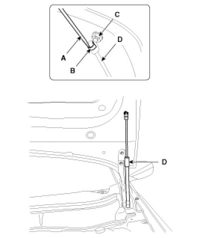 3. After loosening the hood latch (D) mounting bolts, adjust the latch by moving it up or down, or right or left.