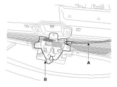 4. Disconnect the hood latch cable (A) and remove the latch (B).