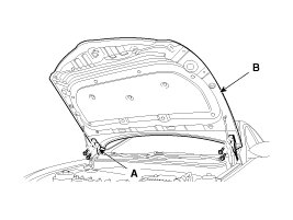 2. After loosening the hood hinge (A) mounting bolts, remove the hood panel (B).