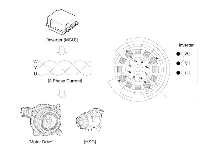 When the inverter (MCU, Motor Control Unit) 3-phase alternating current flows in the winding coil on the stator coil, a rotating magnetic field is formed. This generates rotating torque through electromagnetic induction from the interaction among the magnets embedded in the rotor. This power rotates the motor.