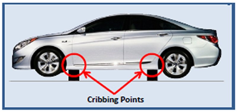 Use standard stabilization (cribbing) points. Always be sure to connect to a structural member of the vehicle, and avoid placing cribbing under high-voltage cables, fuel lines, and other areas not normally considered acceptable.