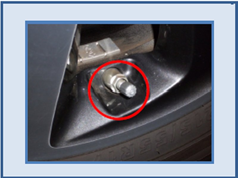 In some instances responders may determine the need to deflate the tires to stabilize the vehicle. In this case, note that this vehicle uses a Tire Pressure Monitoring System. The sensors in the tires are mounted by means of a metal valve stem. To rapidly deflate the tires it might be necessary to snap off the valve stem with pliers or remove the valve cap and Schrader valve.