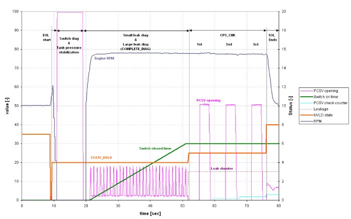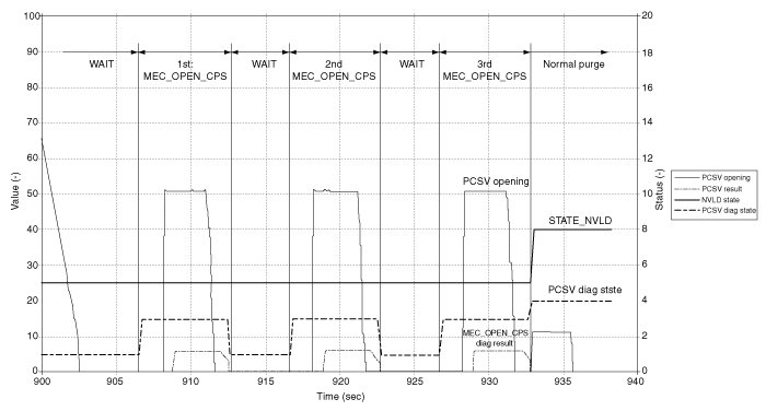 When any large leak failure is detected at previous status, ECM performs PCSV stuck diagnosis to check the root cause to make large leak. ECM opens PCSV and checks the diagnosis results. If the diagnosis results are acceptable, ECM finishes Leak Test Diagnosis and confirms large leakage failure. But if the results are out of range, ECM tries PCSV plausibility diagnosis max 3 times. When the results are still unsatisfactory even after 3 trials. ECM confirms PCSV stuck failure and reports the results.