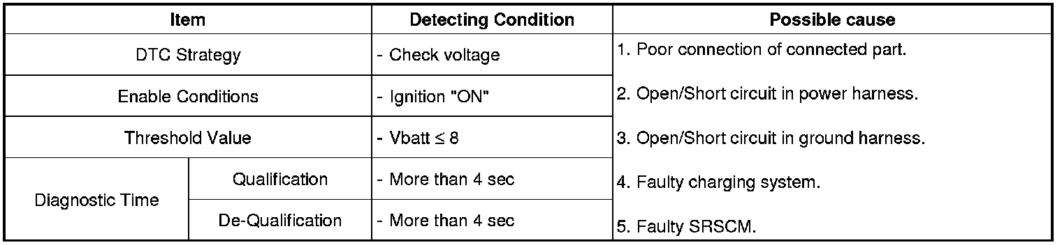 The SRSCM sets DTC B1102 and turns warning light on if voltage below threshold value is detected for more than 4 sec.