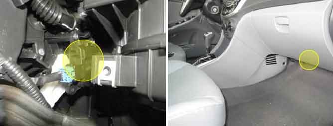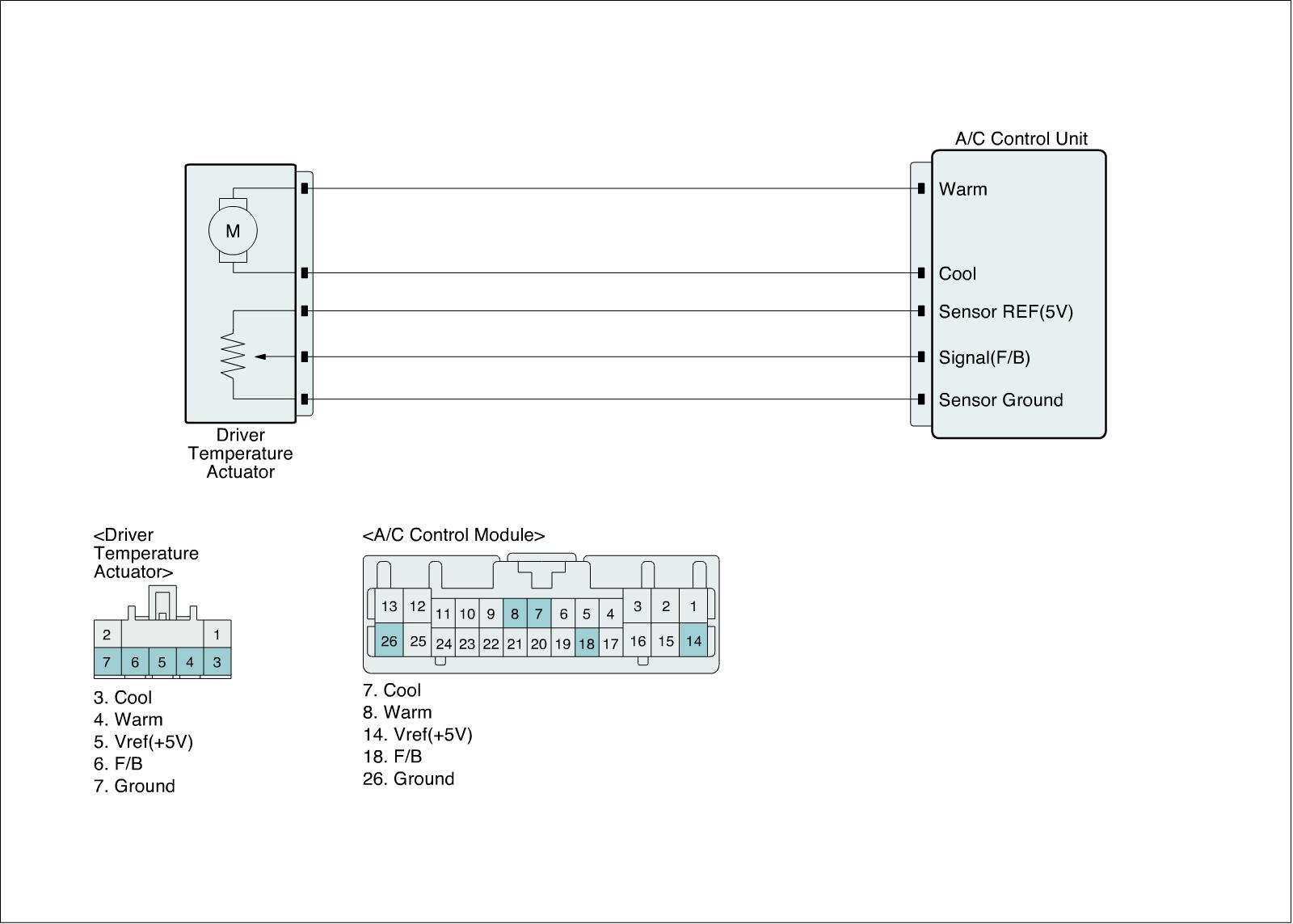The Air mix actuator(Temperature actuator) located at heater unit. It contains temp motor that changes temp door position and potentiometer that monitors position of temp door. The Air mix actuator(Temperature actuator) regulates the temperature by the procedure as follows. Signal from control unit adjusts position of temp door by operating temp motor and then temperature will be regulated by the hot/cold air ratio decided by position of temp door. In operation, potentiometer delivers temp door position transformed into voltage value to A/C ECU.