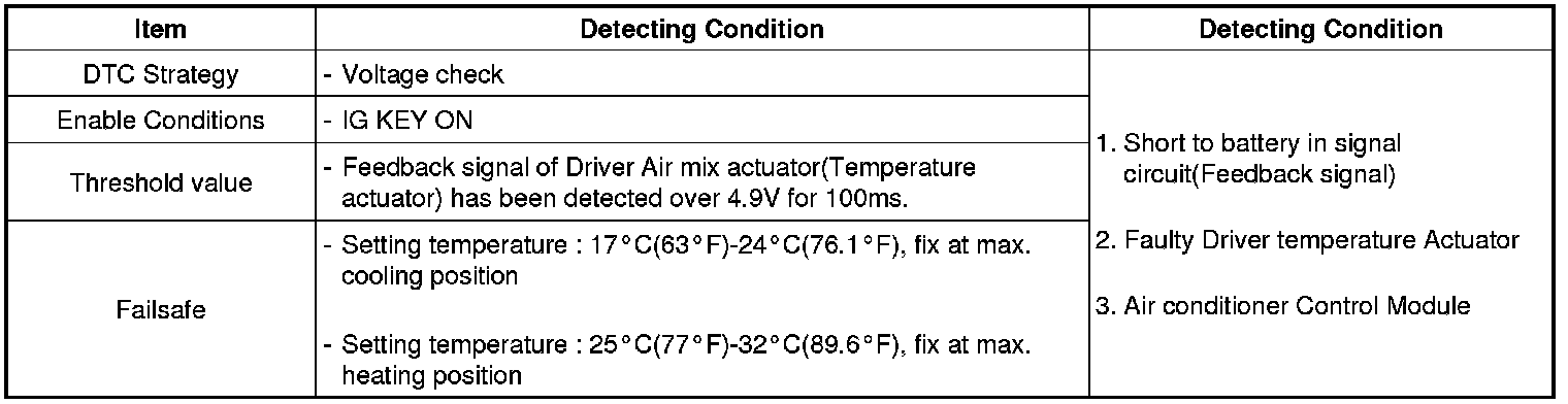 Air conditioner Control Module sets DTC B1246 if Feedback signal of Driver Air mix actuator(Temperature actuator) has been detected over 4.9V for 100ms.