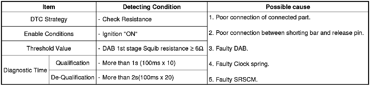 The SRSCM sets DTC B1346 if the measured resistance value of DAB circuit is more than the threshold value.