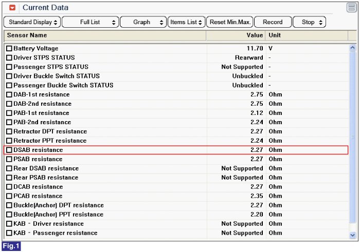 3. Monitor the "Side airbag front-Driver resistance" parameter on the Scantool.