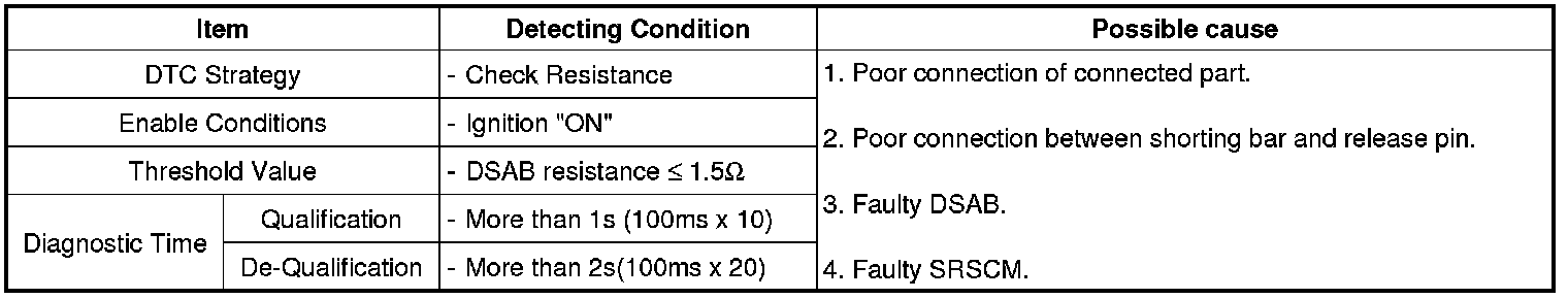 The SRSCM sets DTC B1379 if the measured resistance value of DSAB circuit is less than the threshold value.
