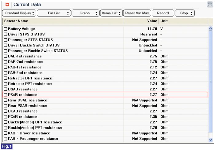 3. Monitor the "Side airbag front-Passenger resistance" parameter on the Scantool.