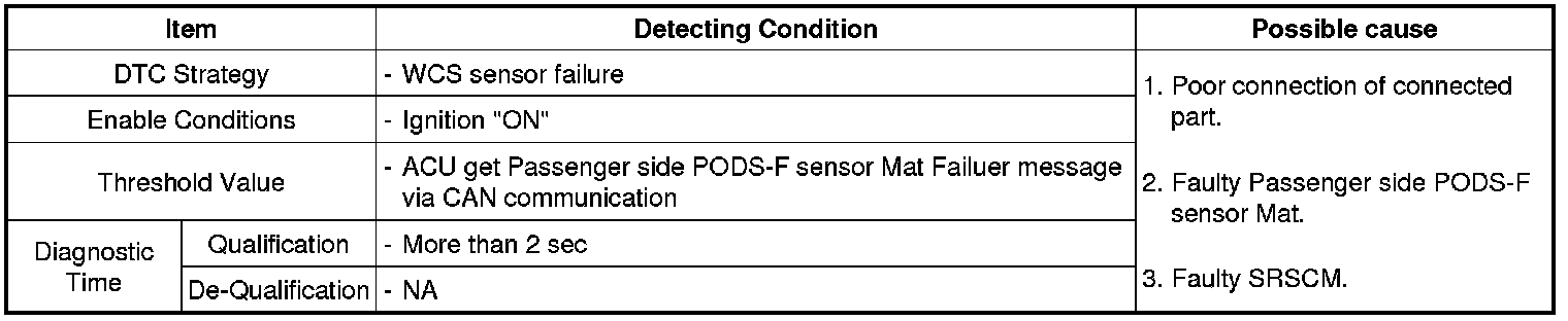 DTC is set if Airbag ECU receives fault message from Passenger side PODS-F sensor Mat via CAN communication.