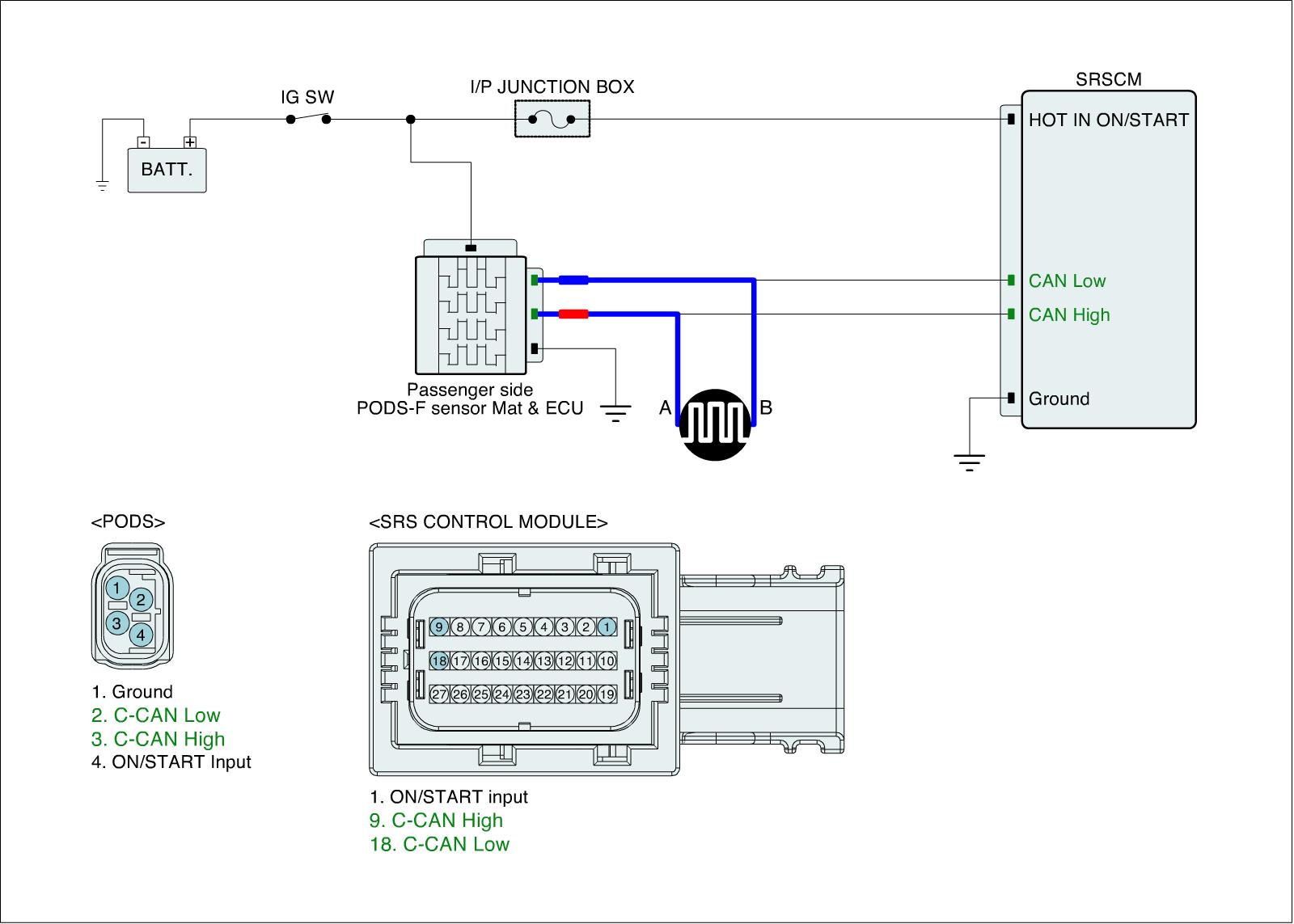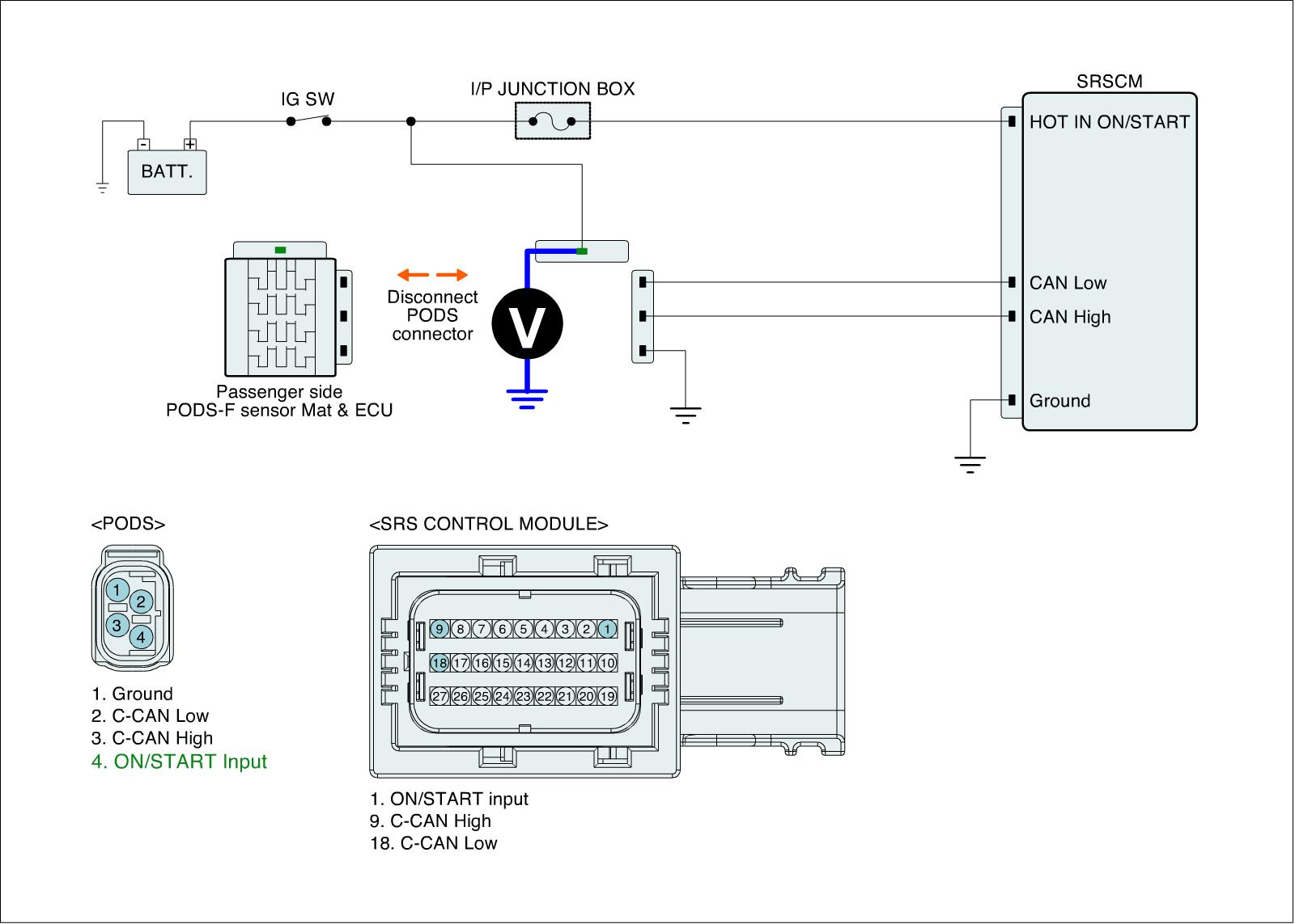 1. Connect SRSCM and Passenger side PODS-F sensor Mat & ECU connector.