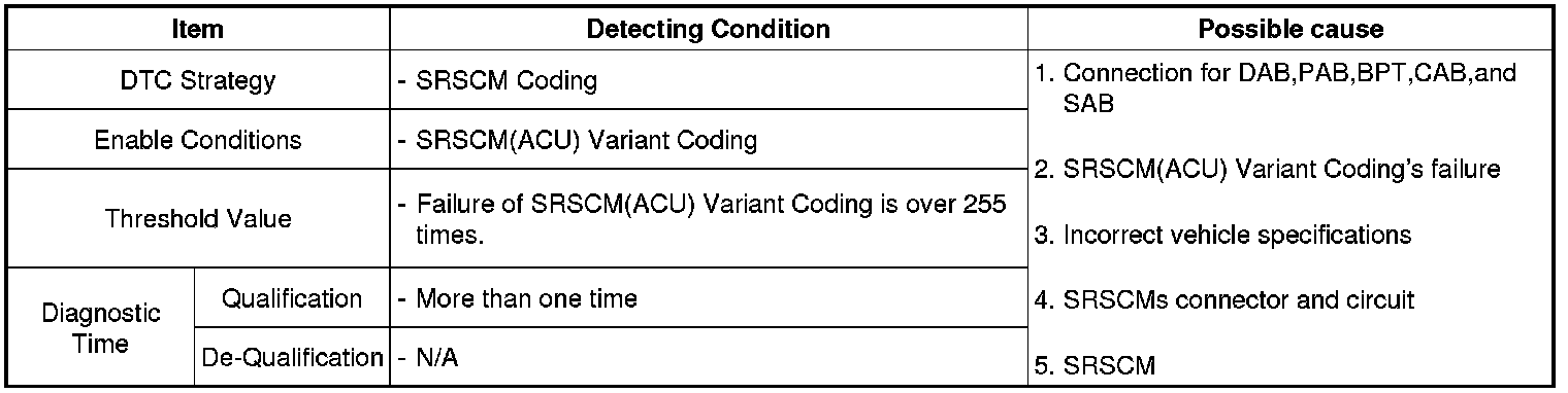 In order to run the airbag system normally, check if there is an incorrect vehicle specfications at performing SRSCM(ACU) Variant Coding. This DTC is set up when SRSCM(ACU) Variant Coding is not done over 255 times.