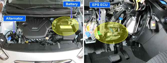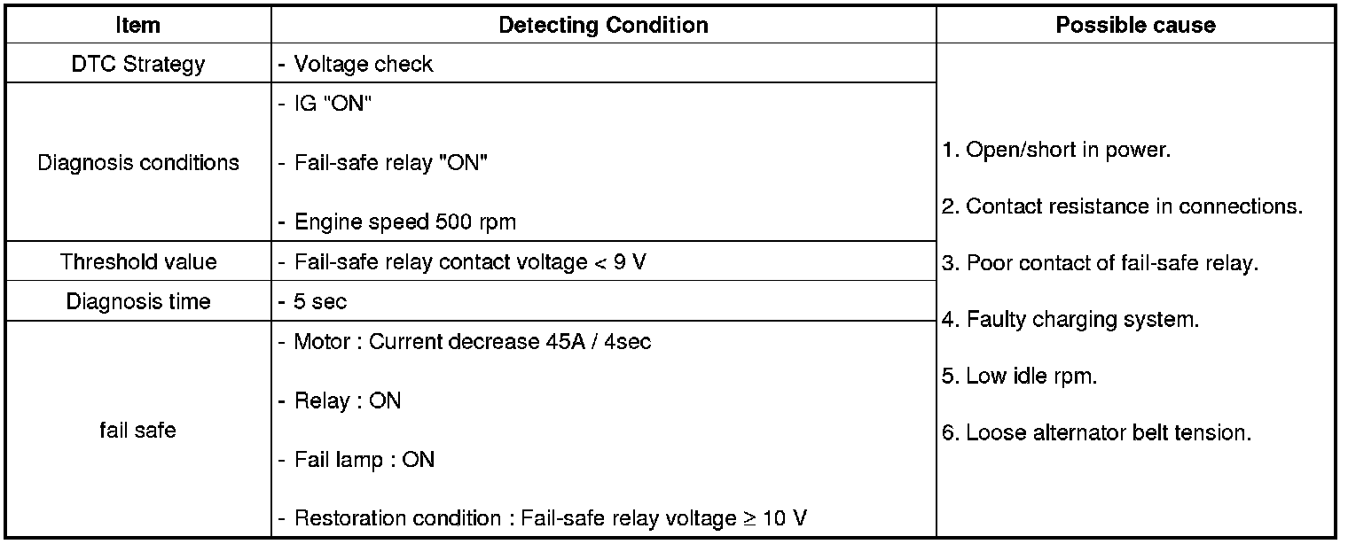 EPS CM sets this code and inhibits the current control of EPS motor if it detects a low voltage operating state has occurred due to a faulty power supply circuit or charging error. EPS CM controls the current of EPS motor accurately by compensating motor control current value according to minute voltage changes and vehicle speed. When power source is below threshold, the EPS CM inhibits the current control of EPS motor using motor current control compensations which are not in range.