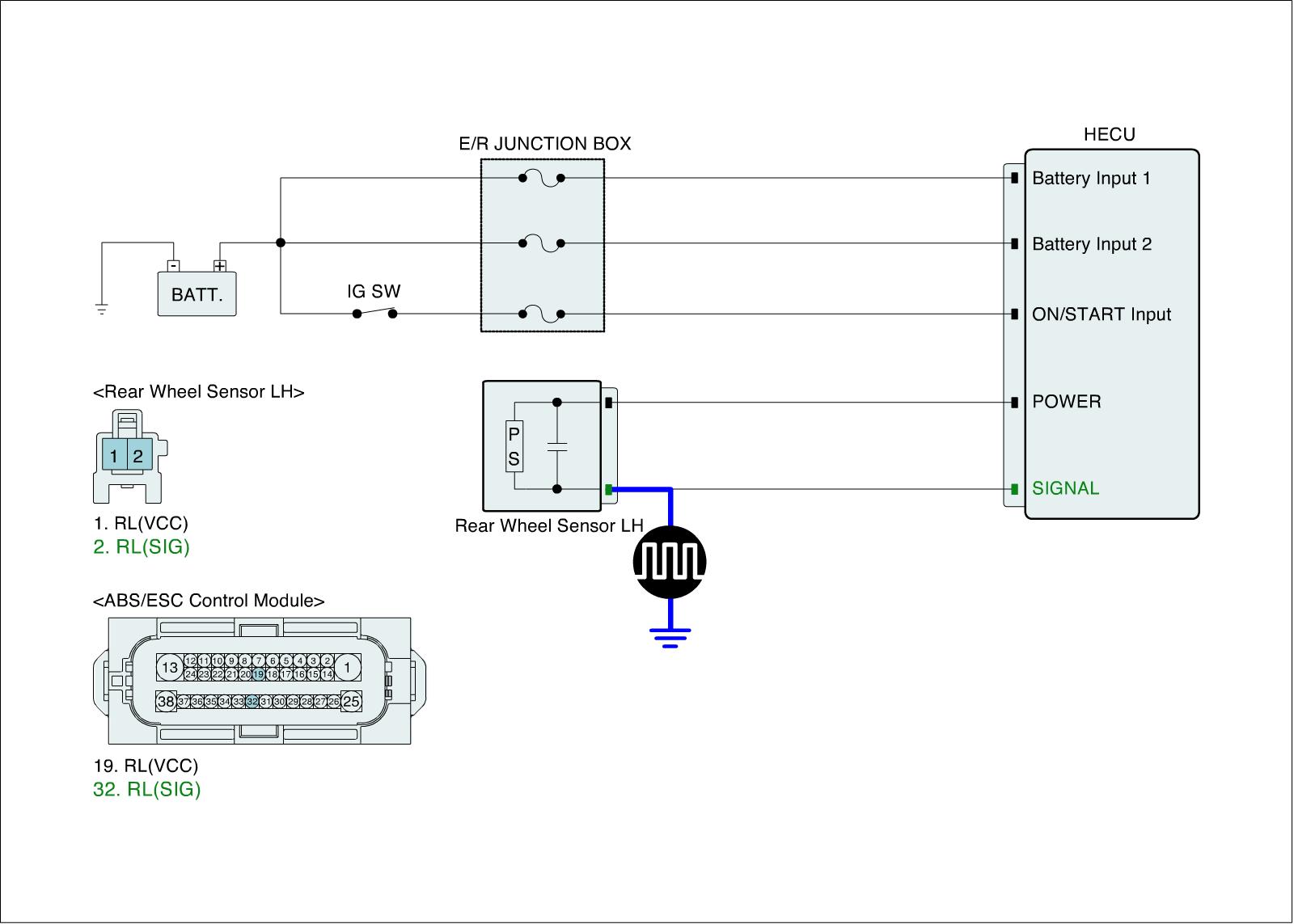 4. Measure waveform between signal terminal of the wheel speed sensor harness connector and chassis ground with osciloscope.