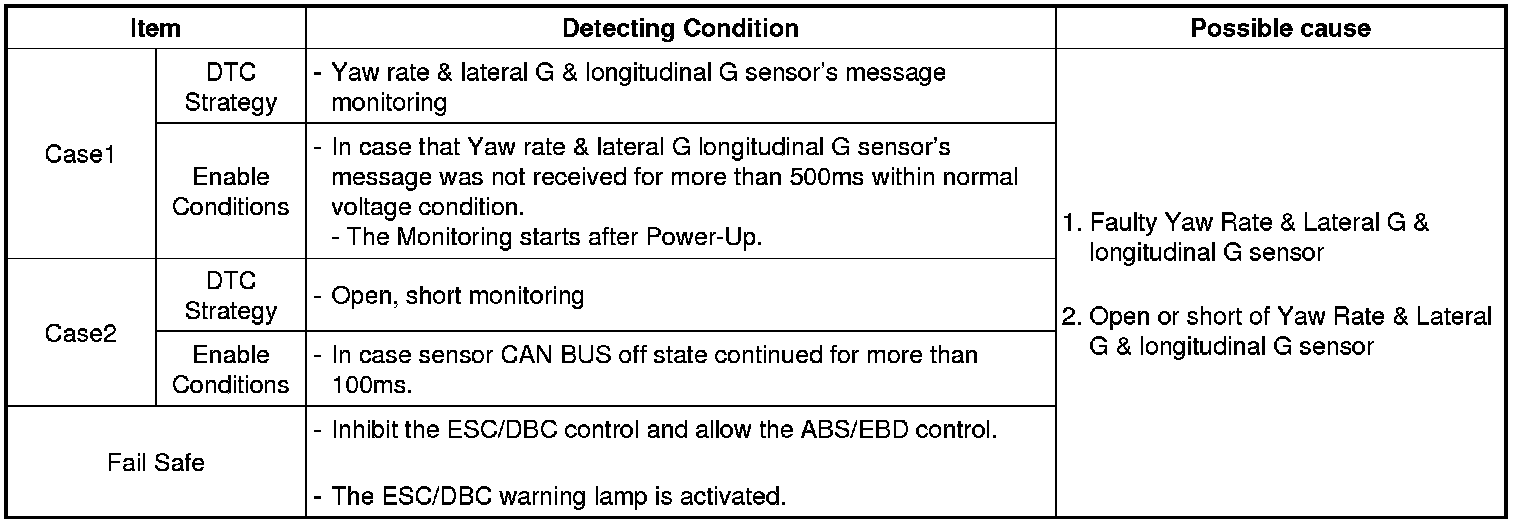 A failure is detected if the Yaw rate & lateral G & longitudinal G sensor's message was not received or the HECU detects the sensor CAN Bus off state for more than the specified failure detection time. The Monitoring starts after Power-Up.